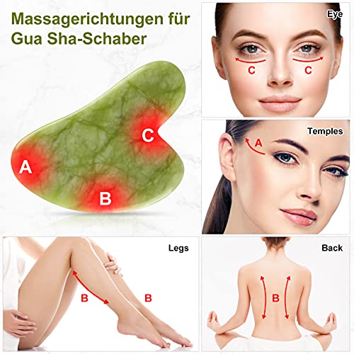 Einfache Verwendung: Setzen Sie die Kante des Gua sha Steins mit leichtem Druck auf die Haut und gleiten Sie sanft in einer leicht aufwärts gerichteten Bewegung zum äußeren Rand des Gesichts. Es funktioniert hervorragend auf Gesicht, Hand, Schulter, Handgelenk, Rücken und Fuß.