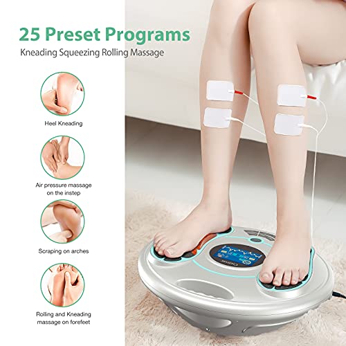【VERBESSERUNG DER ZIRKULATION】Durch die Verbesserung der Durchblutung in den Füßen und Unterschenkeln, lindert das EMS-Fußmassagegerät müde und schmerzende Füße. Jedes Fußpolster ist so strukturiert, dass die Füße während der Behandlung bequem an ihrem Platz bleiben.