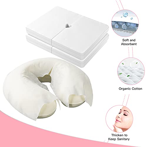 Perfekte Größe mit 100 Gesichtshalterbezügen, misst 30 x 40 cm, perfekte Größe für Standard-Größe U und halbmondförmige Gesichtsstützen. Geeignet für die meisten Massagebetten, kann auf dem Kissen des Massagebetts oder direkt auf dem Bett platziert werden.