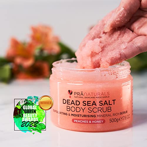 PraNaturals Körperpeeling mit Salz aus dem Toten Meer und Pfirsich & Honig 500g – Feuchtigkeitsspendend & pflegend, mit natürlichen Ölen & Mineralstoffen, keine Parabene, vegan, frei von Tierversuchen
