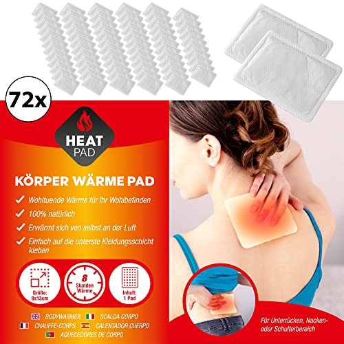 Das Wärmepad im 72er Set spendet wohlige Tiefenwärme bei verspannten Schultern, Rückenbeschwerden, Bauchschmerzen oder wenn es einfach nur kalt ist. Die Bodywärmer passen praktisch in jede Tasche und sind sofort einsatzbereit. Einfach die Packung öffnen, aufkleben, dann dauert es einige Minuten, bis die Wärmer ihre volle Heizleistung entfaltet. Nach Entfernen der Schutzfolie können die Wärmer fast überall angeheftet werden. Die Wärmekissen sind gefüllt mit Aktivkohle und Eisenpulver und wirken durchblutungsfördernd bei Rückenschmerzen, Verspannungen, Muskelkater, Abnutzungserscheinungen und nichtentzündlichen Rheumabeschwerden. Wärmepflaster sind der ideale Begleiter nicht nur für die kalte Jahreszeit.